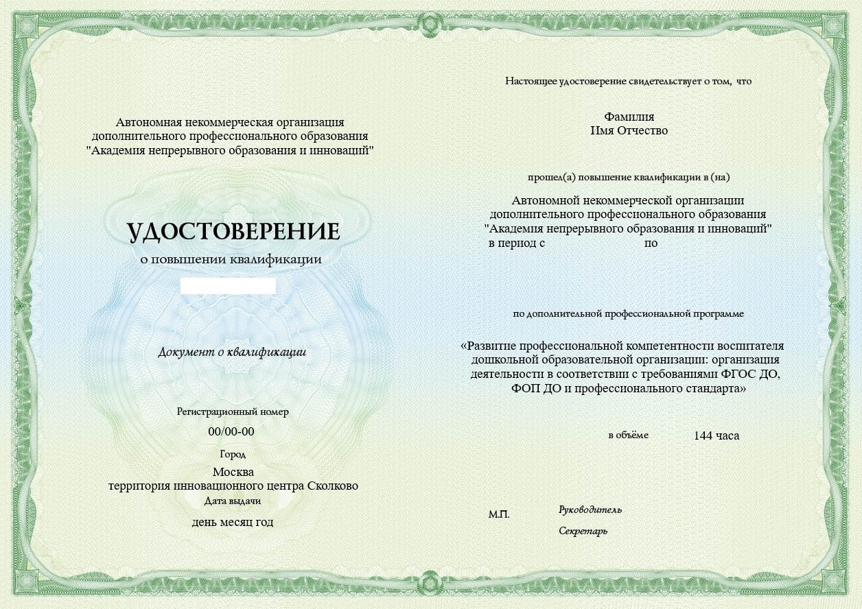 АИПК-100.2 Развитие профессиональной компетентности воспитателя дошкольной образовательной организации: организация деятельности в соответствии с требованиями ФГОС ДО, ФОП ДО и профессионального стандарта, 144 ч.