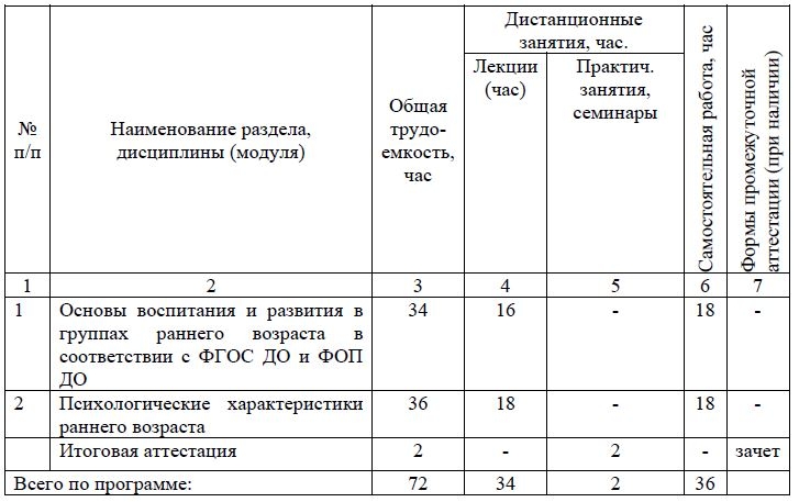 Цель программы: формирование теоретических знаний и совершенствование компетенций в области педагогики и психологии развития детей раннего возраста, психолого-педагогического сопровождения процессов воспитания и образования детей в группах раннего возраста в дошкольной образовательной организации.