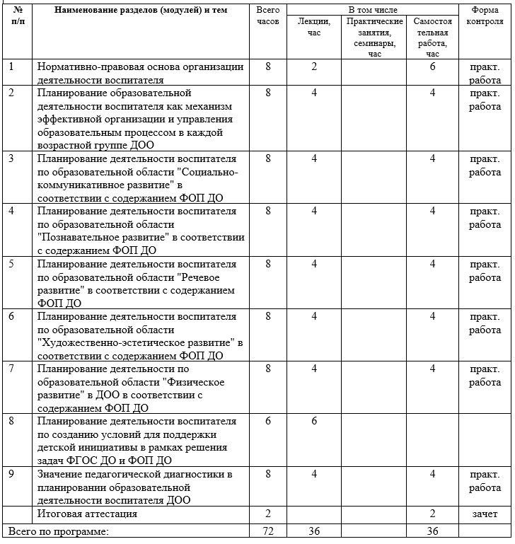 В процессе обучения слушатели познакомятся с нормативно-правовой и методической основами организации деятельности воспитателя; с принципами и условиями успешного планирования; с содержанием образовательной деятельности по пяти образовательным областям; с современными формами и методами реализации содержания.