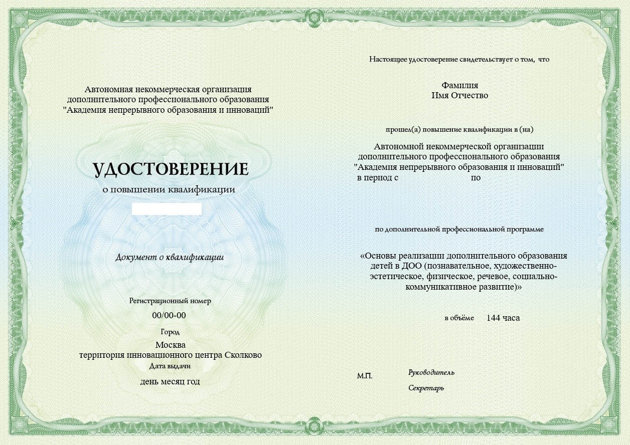 АИПК 1201.9 Основы реализации дополнительного образования детей в ДОО (познавательное, художественно-эстетическое, физическое, речевое, социально-коммуникативное развитие), 144 ч.