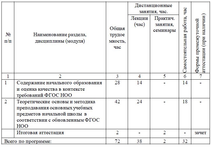 Вводная часть курса рассматривает вопросы общей структуры ФГОС НОО, требования к преподаванию, качеству обучения и его результатам в соответствии со стандартом. Основное содержание программы раскрывает вопросы теории и методики преподавания учебных предметов (отдельных разделов) на ступени начального общего образования в соответствии с ФГОС.