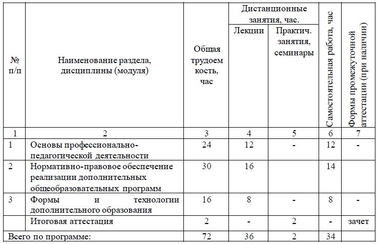 В программе рассматриваются вопросы профессионально-педагогической культуры педагога, нормативно-правового обеспечения реализации дополнительных общеобразовательных программ, организационно-методической деятельности педагога