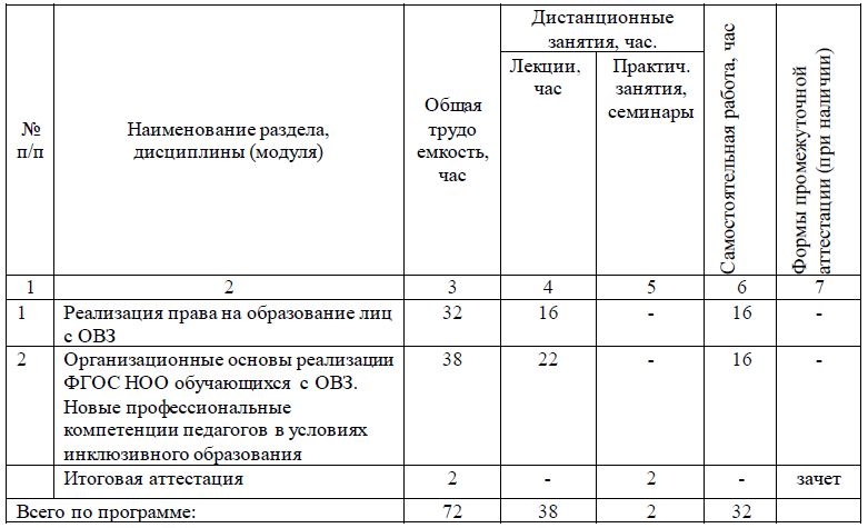Цель программы: развитие профессиональных компетенций педагогов и других специалистов в области организации обучения и воспитания детей с ограниченными возможностями здоровья в соответствии с федеральным государственным стандартом начального общего образования обучающихся с ограниченными возможностями здоровья.