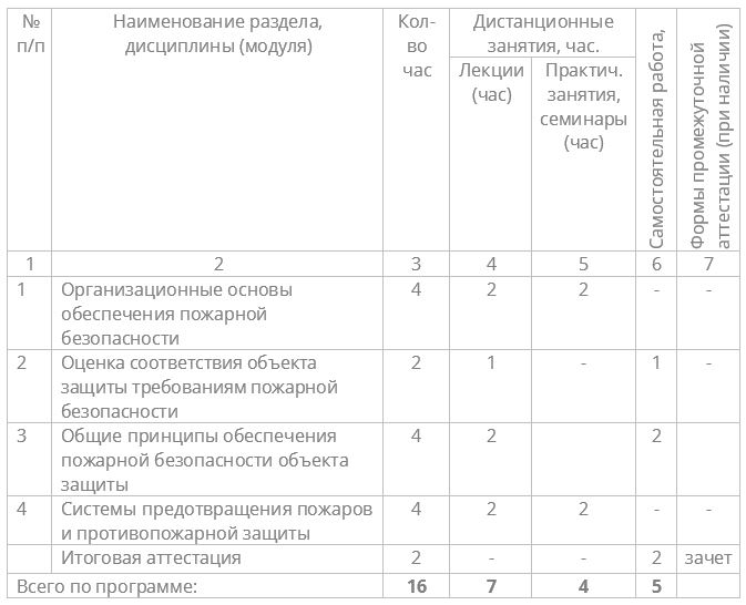 Категория слушателей: лица, ответственные за обеспечение пожарной безопасности на объектах защиты, в которых могут одновременно находиться 50 и более человек, объектах защиты, отнесенных к категориям повышенной взрывопожароопасности, взрывопожароопасности, пожароопасности, к которым относятся руководители органа государственной власти, органа местного самоуправления, общественного объединения, юридического лица, граждане (физические лица), в том числе индивидуальные предприниматели, являющиеся собственниками имущества, лица, уполномоченные владеть, пользоваться или распоряжаться имуществом, либо назначенные ими лица.