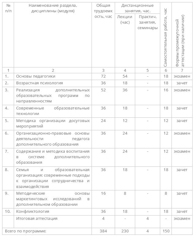Программа направлена на формирование теоретических знаний в области педагогики, психологии, воспитания и получение компетенций, необходимых для выполнения профессиональной педагогической деятельности и трудовых функций по реализации образовательной, воспитательной и развивающей деятельности в сфере дополнительного образования: